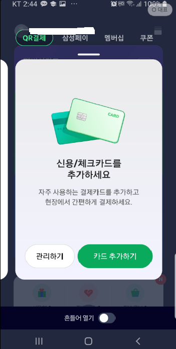 아래의 화면에서 왼쪽으로 2번을 밀면 다음과 같은 화면에서 카드추가하기가 나옵니다.